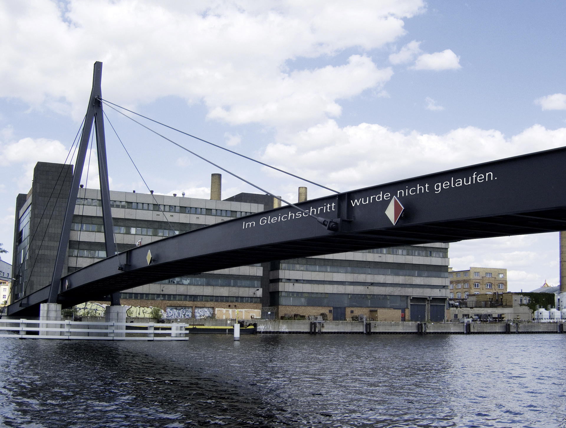 Das Zitat auf der äußeren westlichen Seite »Im Gleichschritt wurde nicht gelaufen« signalisiert mehrdeutig und bereits aus der Ferne, dass es sich hier um einen geschichtsträchtigen Ort in Schöneweide handelt.